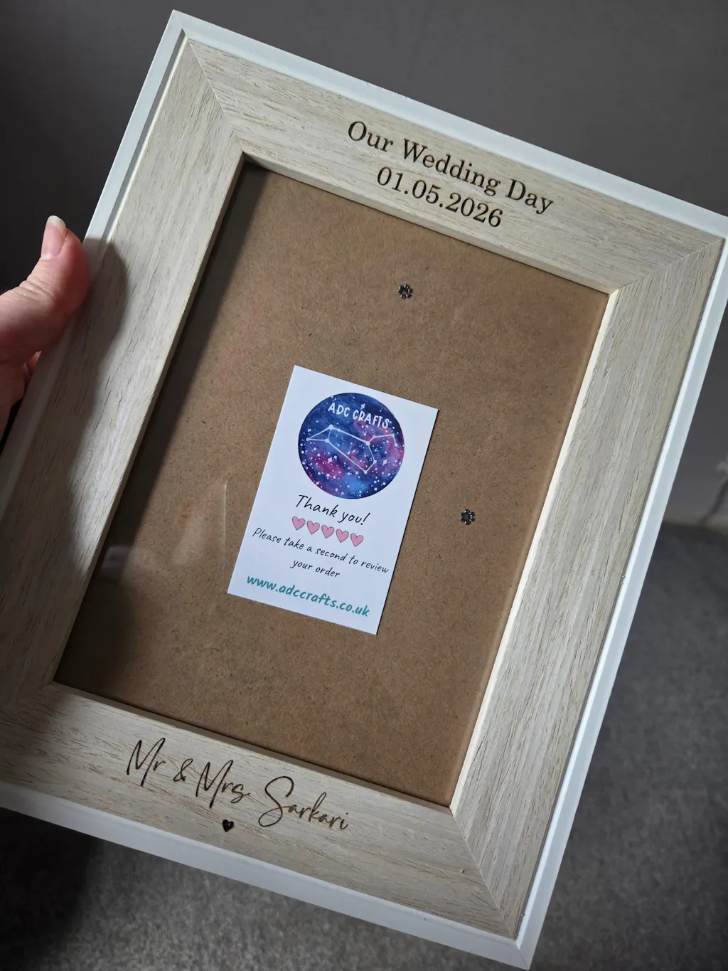 Capture the beauty and significance of a couple's special day with our personalised wooden wedding frame. Crafted with love and attention to detail, this frame is a timeless keepsake that commemorates the beginning of a special journey.