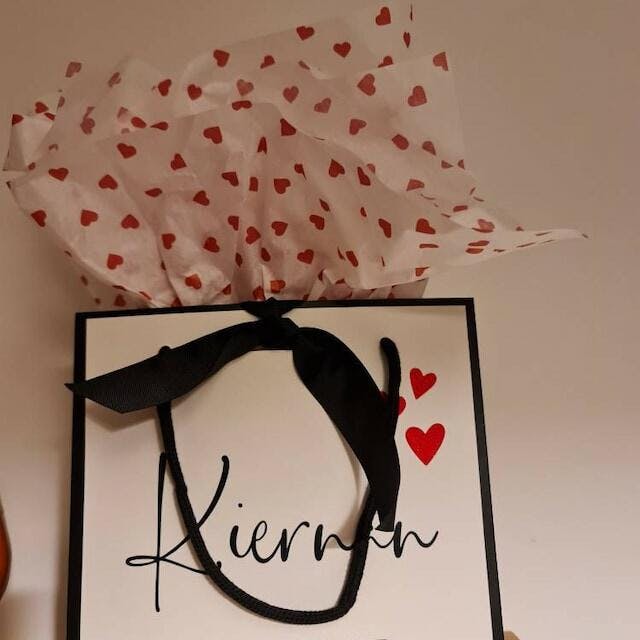 These luxury high-quality personalised gift bags are perfect to make your Valentine's gifts feel and look extra special. Personalised with a name and hearts colour (red/gold/black) of your choice.